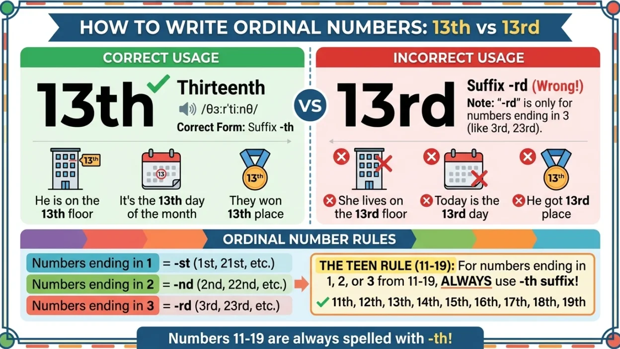 Many learners get confused when writing numbers like 13rd and 13th. Both look similar, and people often guess which ending to use. This confusion happens because English ordinal numbers (like 1st, 2nd, 3rd, 4th) follow patterns but also have some exceptions.