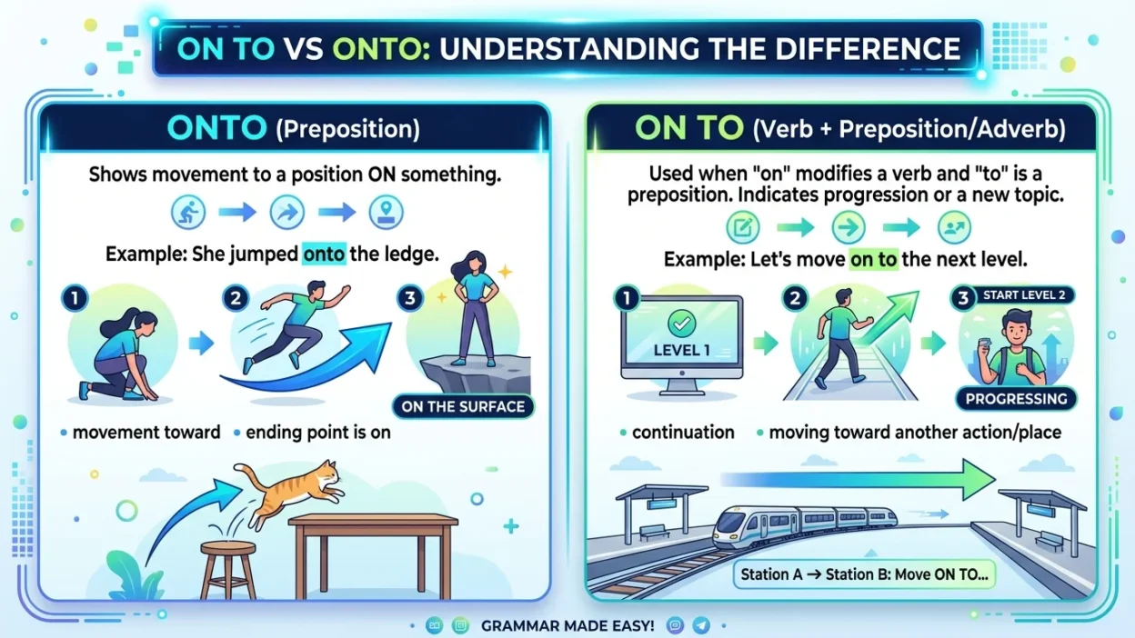 Many learners feel confused about “on to” and “onto” because they look almost the same. The only difference is a space, but that small detail changes the meaning and usage.